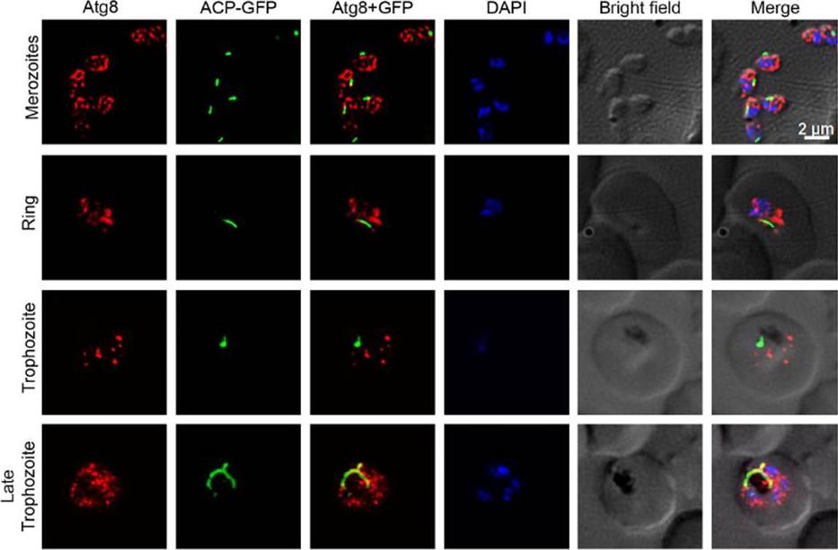 Colocalization of Atg8 and the apicoplast. The indicated stages of P. falciparum D10 parasites expressing the apicoplast marker ACP-GFP were evaluated for colocalization of PfAtg8 with the apicoplast. The images show PfAtg8 (Atg8) and apicoplast (ACP-GFP), merged Atg8 and apicoplast signals (Atg8+GFP), nuclear stain (DAPI), parasite and erythrocyte boundaries (Bright field), and the merged of all the four images (Merge). Note that PfAtg8 signal is distributed throughout the parasite as puncta, which partially overlaps with the apicoplast, particularly in the late trophozoite stage.Navale R, Atul, Allanki AD, Sijwali PS. Characterization of the Autophagy Marker Protein Atg8 Reveals Atypical Features of Autophagy in Plasmodium falciparum. PLoS One. 2014 Nov 26;9(11):e113220. PMID: