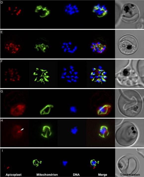 Widefield epifluorescence microscopy for the nucleus (Hoechst), apicoplast (ACP-GFP), and mitochondria (MitoTracker®619.Bowman JD, Merino EF, Brooks CF, Striepen B, Carlier PR, Cassera MB. Anti-apicoplast and gametocytocidal screening to identify the mechanisms of action of compounds within the Malaria Box. Antimicrob Agents Chemother. 2013 58(2):811-9