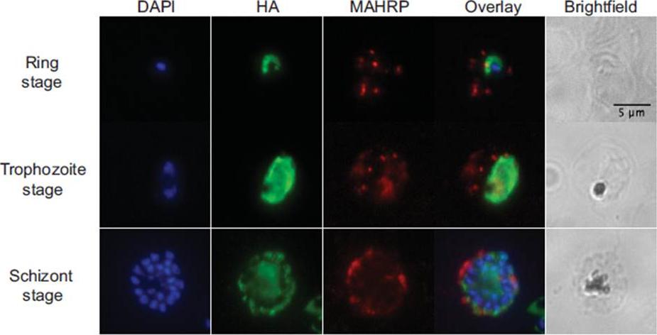 Immunofluorescence. Air-dried thin films of ring (12 hpi), trophozoite (28 hpi) and schizont (44 hpi) stage parasites were fixed in 4% paraformaldehyde, permeabilized with 0.1% Triton X-100, blocked with 3% BSA in phosphate-buffered saline for 1h at RT, incubated with rat α-HA antibody (clone 3F10, 1:50, Roche) at 4oC overnight, and detected with Alexa488-conjugated goat α-rat antibody (1:1000, Invitrogen) for 1h at RT. For PfMAHRP1 co-staining, rabbit α-PfMAHRP1 was added at 1:500 and detected with Alexa555-conjugated goat -rabbit (1:1000, Invitrogen). Slides were mounted with Vectashield anti-fading media containing 4',6-diamidino-2-phenylindole (Vector Laboratories) for nuclear counterstaining. Images were acquired with 100x objectives using a Nikon E800 Microscope. The images were analyzed using ImageJ. PfRACK1 localizes diffusely within the parasite cytoplasm, but not overlapping with the nuclei. we do not observe any exported PfRACK1 in the host cell cytoplasm or in Maurer’s clefts (identified by staining with antibodies directed against PfMAHRP.Blomqvist K, DiPetrillo C, Streva VA, Pine S, Dvorin JD. Receptor for Activated C-Kinase 1 (PfRACK1) is required for Plasmodium falciparum intra-erythrocytic proliferation. Mol Biochem Parasitol. 2016 Oct 9. pii: S0166-6851(16)30129-3.
