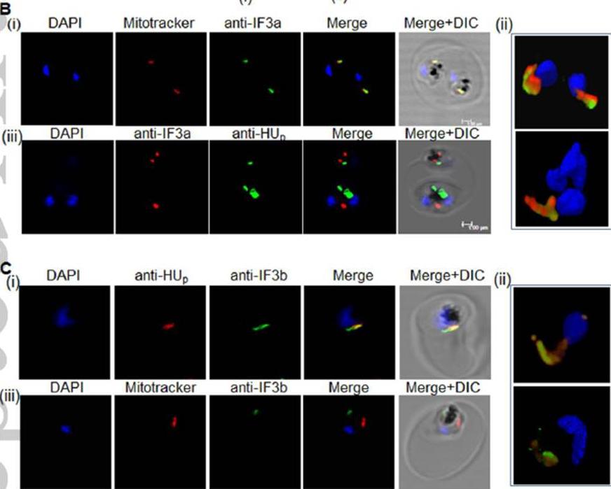 Immunofluorescence localization of PfIF3a and PfIF3b. (B) Panel i, P. falciparum-infected erythrocytes stained with Mitotracker Red and probed with PfIF3a antiserum; panel ii, 3-dimensional reconstruction after z-sectioning shows clear overlay of the PfIF3a signal with the mitochondrion; panel iii, Absence of overlap of the PfIF3a signal with apicoplast PfHU. (C) Panel i, parasitized erythrocytes probed with anti-IF3b and anti-HUp anti-sera; panel ii, 3-dimensional reconstruction shows overlap of IF3b with apicoplast HUp; panel iii, PfIF3b signal does not overlap with Mitotracker Red. Nuclear DNA is stained with DAPI.Haider A, Allen SM, Jackson KE, Ralph SA, Habib S. Targeting and function of proteins mediating translation initiation in organelles of Plasmodium falciparum. Mol Microbiol. 2015 Feb 17. [Epub ahead of print]