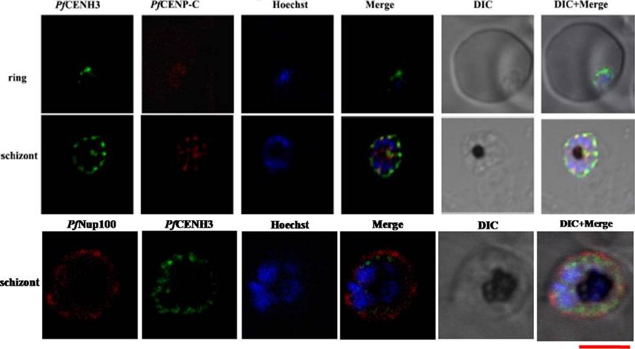 Upper: Colocalization of PfCENH3 with PfCENP-C. Confocal images showing the co-localization of the putative PfCENP-C (red) and PfCENH3 (green) at the nuclear periphery. The nucleus is stained with Hoechst (blue). Scale bar = 5 mm. Lower: The fluorescence pattern obtained on merging PfCENH3 and PfNup100with the nucleus depicts that PfCENH3 localizes to the nuclear periphery just outside the Hoechst stained nucleus but well within the PfNup100 that marks the outer nuclear boundaries.Verma G, Surolia N. Plasmodium falciparum CENH3 is able to functionally complement Cse4p and its, C-terminus is essential for centromere function. Mol Biochem Parasitol. 2013 Dec 6. [Epub ahead of print]