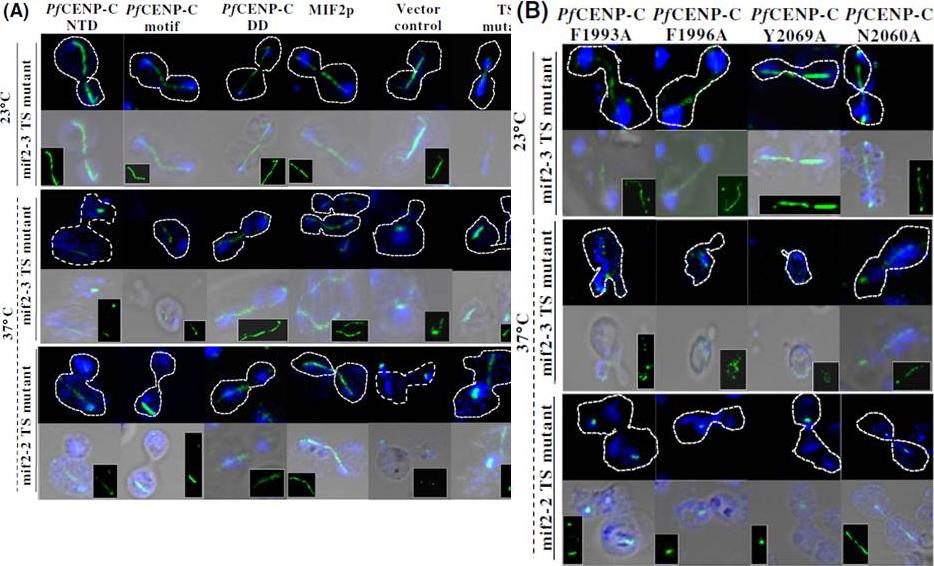 Functionally essential residues lie within the PfCENP-C dimerization domain. the phenotypic changes exhibited by the dimerization domain mutants PfCENP-CF1993A, PfCENPCF1996A, PfCENP-CY2069A and PfCENP-CN2060A were assessed at 23 and 37°C, respectively. At 23°C, mif2-3 and mif2-2 TS mutant cells expressing different PfCENP-C dimerization domains show proper chromosome segregation and normal bud morphology. At 37°C, ~90-94% of mif2-3 and mif2-2 TS mutant cells expressing PfCENP-CF1993A, PfCENP-CF1996A and PfCENP-CY2069A are mitotically arrested and unviable. This is evident by the aberrant bud morphologies with fragmented nucleus or loss of nuclear staining. These abnormal phenotypes are attributable to the failure of PfCENP-C dimerization domain mutants to dimerize resulting in impaired growth, defective chromosome segregation and loss of viability. Verma G, Surolia N. The dimerization domain of PfCENP-C is required for its functions as a centromere protein in human malaria parasite Plasmodium falciparum. Malar J. 2014 Dec 4;13(1):475.