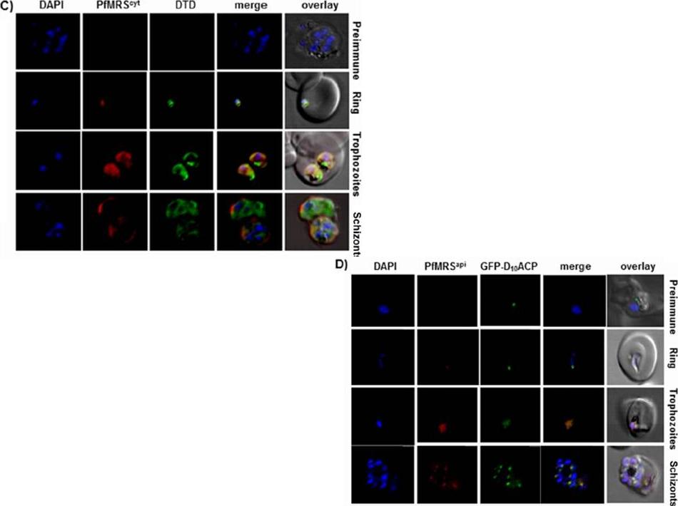 Localization of PfMRScyt using antibodies directed against the N-terminal domain. The protein localizes in the cytoplasm for all asexual parasite stages. (D) Localization ofMRSapi, studied using antibodies against the anticodon binding domain. Localization of MRSapi in apicoplasts in three asexual stages (ring, trophozoite, and schizont) was verified.Hussain T, Yogavel M, Sharma A. Inhibition of protein synthesis and malaria parasite development by drug targeting of methionyl-tRNA synthetases. Antimicrob Agents Chemother. 2015 Apr;59(4):1856-67.