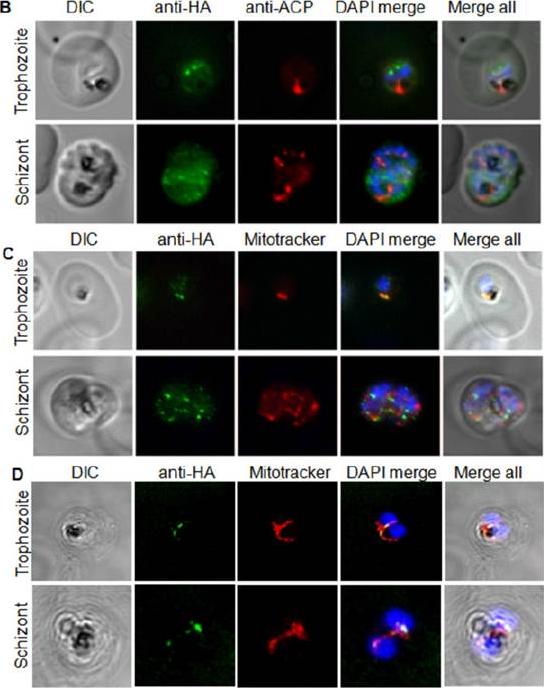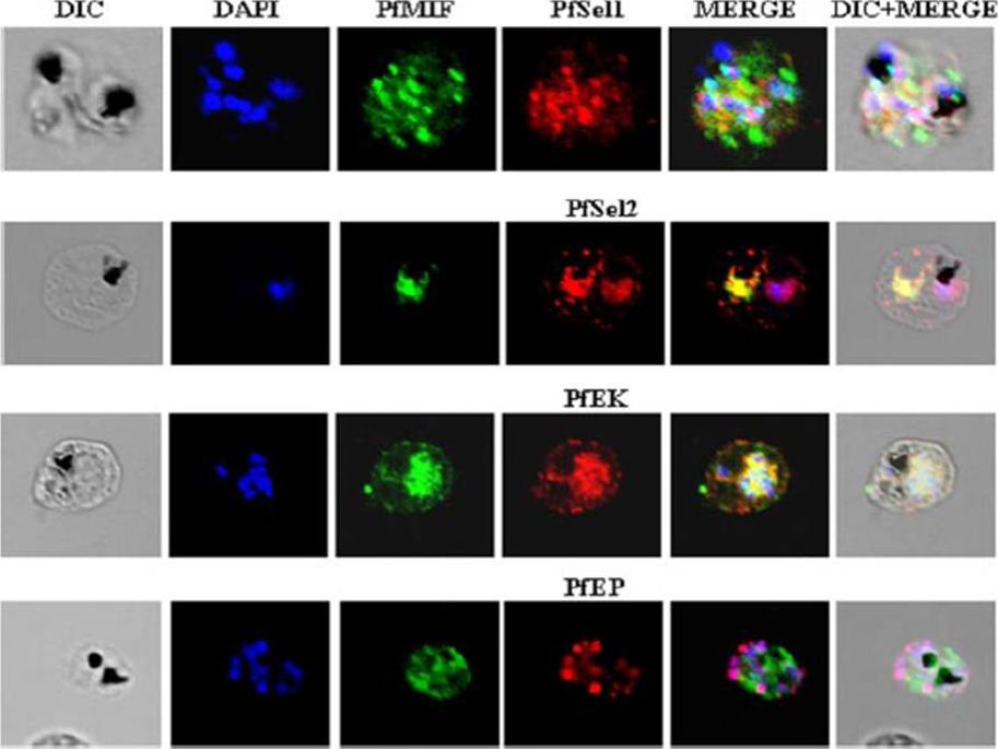 Indirect immunofluorescence assay and confocal microscopy to localize the selected excretory-secretory antigens by coimmunostaining of P. falciparum-infected erythrocytes. Air-dried infected erythrocytes were incubated with mouse antibodies specific to the selected proteins at 1:100 dilution (column 4; red). Rabbit aPfMIF antibody was used as a co-localization marker (column 3; green). The parasite nuclei were stained with 4’,6-diamidino-2-phenylindole (DAPI) (column 2; blue). Columns 1, 5, and 6 show a differential interference contrast (DIC) image, merged image, and differential interference contrast with merged image, respectively. Images showed punctate vesicle-like staining of the infected RBCs with antibodies to PfSEL1 (PFB0190c), PfSEL2 (Hrd3), PfEKand PfEP. PfEK also showing specific rimlike staining of the plasma membrane of the infected RBC. PfMIF is exported via the Maurer clefts to the extracellular medium after schizont rupture. A partial co-localization of PfMIF was seen with each of the four proteins, suggesting a distinct pathway for the release of these ESAs.Singh M, Mukherjee P, Narayanasamy K, Arora R, Sen SD, Gupta S, Natarajan K, Malhotra P. Proteome analysis of Plasmodium falciparum extracellular secretory antigens at asexual blood stages reveals a cohort of proteins with possible roles in immune modulation and signaling. Mol Cell Proteomics. 2009 8(9):2102-18.