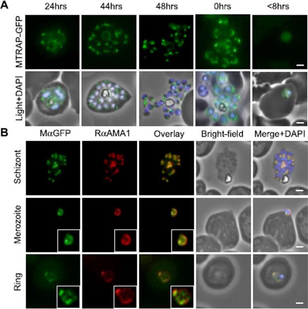 MTRAP undergoes extensive processing during invasion. A, episomally expressed MTRAP-GFP followed through the life cycle confirms apical localization (44–48 h) suggests the release of MTRAP onto the surface of free merozoites (capping, 0 h) and suggests that, despite processing, the cytoplasmic tail is carried through to newly invaded rings (<8 h). B, this is confirmed by following co-localization with antibodies that recognize AMA1, which have been previously reported as being carried through to rings. In early ring stages, there does not appear to be direct co-localization, suggesting that they may be associating with different compartments. Baum J, Richard D, Healer J, Rug M, Krnajski Z, Gilberger TW, Green JL, Holder AA, Cowman AF. A conserved molecular motor drives cell invasion and gliding motility across malaria life cycle stages and other apicomplexan parasites. J Biol Chem. 2006 281(8):5197-208.
