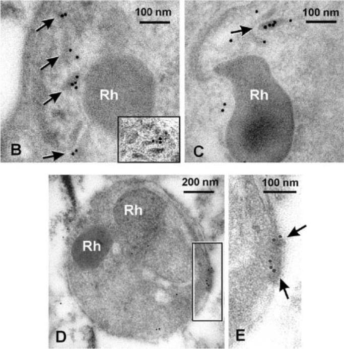 PfSUB2 Is a Microneme Protein. Electron micrographs showing immuno-gold labelling of micronemes within late-stage schizonts of PfSUB2HA clone 2D using: (B) anti-HA mAb 3F10, detecting epitope-tagged PfSUB2; and (C) a polyclonal antibody specific for PfAMA1. The inset in (B) shows another example of micronemal staining with mAb 3F10 from another schizont. Rh, rhoptry. (D and E) Posterior labelling of with anti-HA mAb 3F10 in a free merozoite of PfSUB2HA clone 2D. Arrows indicate immuno-gold labelling. Rh, rhoptry.Harris PK, Yeoh S, Dluzewski AR, O'Donnell RA, Withers-Martinez C, Hackett F, Bannister LH, Mitchell GH, Blackman MJ. Molecular identification of a malaria merozoite surface sheddase. PLoS Pathog. 2005 1(3):241-51.