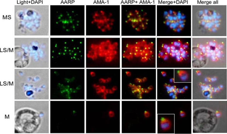 Spatial localization of merozoite’s microneme resident proteins AMA-1 and PfAARP by co-immunostaining with anti-PfAARP (green) and anti-AMA-1 (red) Abs: both showed punctate staining in the schizonts. In the late schizonts and merozoites, AMA-1 was present over the entire surface of the merozoites but is most densely distributed at their apical tip. Enlarged image of selected individual merozoite is shown in the inset. Wickramarachchi T, Devi YS, Mohmmed A, Chauhan VS. Identification and characterization of a novel Plasmodium falciparum merozoite apical protein involved in erythrocyte binding and invasion. PLoS ONE. 2008 Mar 5;3(3):e1732.