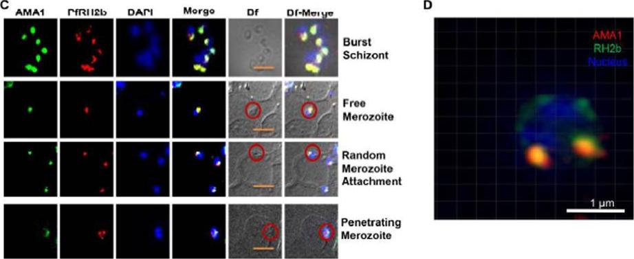 Immunofluorescence assay showing co-localization of PfRON2 with PfAMA1 at apical end at the time of meozoite attachment during merozoite invasion. At the time of attachment of the merozoite with the host RBCs, the PfRON2 staining was at the apical tip, the PfAMA1 staining was also mainly at the apical tip and with some distribution at the merozotie surface. During parasite invasion, the PfRON2 and PfAMA1 showed col-ocalization at the apical end of merozoite.Hossain ME, Dhawan S, Mohmmed A. The cysteine-rich regions of Plasmodium falciparum RON2 bind with host erythrocyte and AMA1 during merozoite invasion. Parasitol Res. 2011 110(5):1711-21