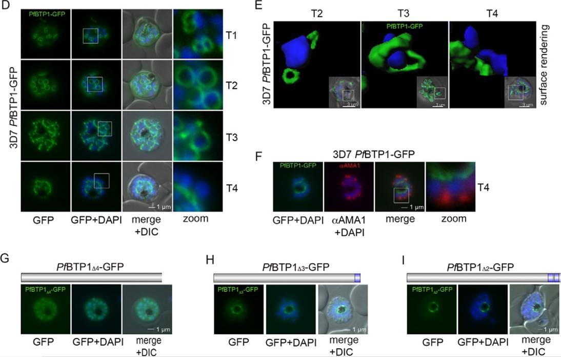 Expression and localization of BTP1. (D) BTP1–GFP can be visualized as a contractile ring structure in unfixed late-stage parasites (T1–T4). It first appears at the apical pole of the nascent merozoite (T1) and ends up at the basal pole of the mature merozoite (T4). Nuclei were stained with DAPI (blue). Enlargement of selected areas are marked with a white square and referred to as ‘zoom’ (a fourfold magnification). (E) Surface-rendering plot of an indicated section, highlighting the spatial relationship between nuclei and the basal-complex ring. (F) Colocalization of BTP1–GFP and the apical membrane antigen 1 (αAMA1; red); AMA1 localizes in the micronomes at the apical pole opposing BPT1, confirming the basal localization of BTP1–GFP at the end of daughter cell formation. (G–I) Localization of the BPT1 deletion mutants. (G) Deletion of all four transmembrane domains leads to a nuclear and cytosolic distribution of BTP1Δ4−GFP. (H) Expression of BTP1 with one (BTP1Δ3−GFP) or two (BTP1Δ2−GFP, I) transmembrane domains results in localization of mutant BTP1 at the food vacuole membrane. DIC, differential interference contrast.Kono M, Heincke D, Wilcke L, Wong TW, Bruns C, Herrmann S, Spielmann T, Gilberger TW. Pellicle formation in the malaria parasite. J Cell Sci. 2016 129(4):673-80.