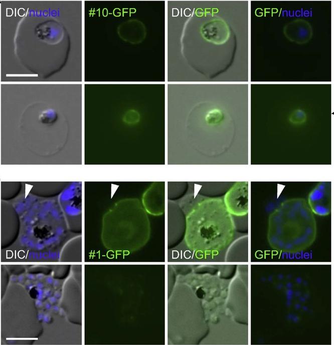 Saponin lysis during microscopy of a cell expressing parasitophorous vacuolar protein 2 (upper panel). The identical infected RBC is shown before (top row) and after (bottom row) lysis with saponin. release of the PV content using saponin did not abolish the signal in the parasite periphery, clearly showing that the signal around the parasite with PV2derives from the full-length protein. (B) A late schizont expressing serine/threonine protein phosphatase UIS2 (bottom panel) shows release of merozoites (arrow head) while the fluorescence still surrounds the bulk of the remainder of merozoites (top row) and no fluorescence is observed in released merozoites (bottom row). Some late stages were observed where merozoites had already been partially released but, in contrast to the merozoites in the remainder of the schizont, were not surrounded by GFP signal (arrowheads). As the released merozoites aresurrounded by PPM, this indicates that these proteins were associatedwith the PVM. In agreement with this, no fluorescence was observedwith fully released merozoites.Khosh-Naucke M, Becker J, Mesén-Ramírez P, Kiani P, Birnbaum J, Fröhlke U, Jonscher E, Schlüter H, Spielmann T. Identification of novel parasitophorous vacuole proteins in P. falciparum parasites using BioID. Int J Med Microbiol. 2017 Jul 27. [Epub ahead of print]