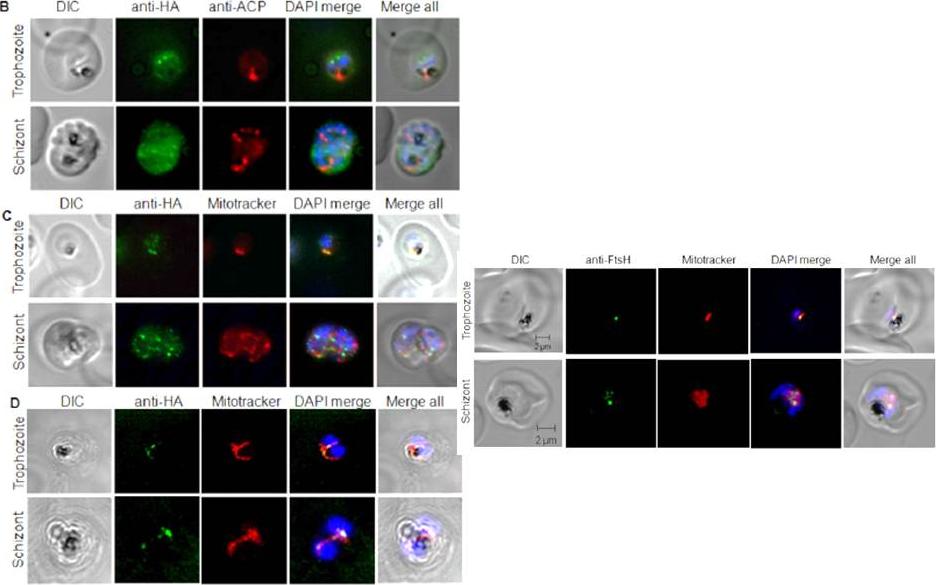 Two upper panels: Localisation of PfFtsH1 in a P. falciparum 3D7 transfectant line carrying C-terminal 3xHA-tagged PfFtsH1. (B) Immunofluorescence localization of PfFtsH1-HA using the anti-HA mAb and antibody against the apicoplast marker ACP. No overlap of PfFtsH1-HA signal was observed with the apicoplast marker. (C) PfFtsH1 co-localizes with the mitochondrial signal in trophozoites (upper panel) and appears as punctuate signals lining the organelle defined by the mitochondrial stain Mitotracker Red in schizonts (lower panel). (D) Confocal microscopy PfFtsH1-HA expressing parasites showing co-localisation of PfFtsH1 with the mitochondrion which is stained with Mitotracker Red.Lower panel: Localization of PfFtsH1 to the mitochondrion is confirmed by immunofluorescence with anti-FtsH1 Ab. Confocal immunofluorescence microscopy of P. falciparum 3D7 infected erythrocytes using Mitotracker Red and anti-FtsH1 Ab shows localization of PfFtsH1 in the parasite mitochondrion.Tanveer A, Allen SM, Jackson KE, Charan M, Ralph SA, Habib S. An FtsH protease is recruited to the mitochondrion of Plasmodium falciparum. PLoS One. 2013 8(9):e74408.