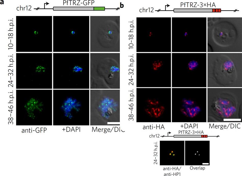 Genome-wide binding profile of PfTRZ. a,b, Localization of endogenous PfTRZ-GFP (a) and PfTRZ-3×HA (b), detected by IFA in three different IDC stages. h.p.i., hours post-invasion. Scale bars, 5 μm. Results are representative of three biological replicate experiments. transgenic parasites expressing PfTRZ-GFP (3D7/TRZGFP) or PfTRZ-3×HA (3D7/TRZHA) (HA, haemagglutinin) from the endogenous locus (Supplementary Fig. 2). As expected, both PfTRZ-GFP and PfTRZ-3×HA localized to distinct foci at the nuclear periphery throughout the intra-erythrocytic developmental cell cycle (IDC) (Fig. 2a–c). Consistent with the consecutive rounds of genome duplication and nuclear division during schizogony, the number of PfTRZ foci and total PfTRZ expression levels increased in schizonts.Bertschi NL, Toenhake CG, Zou A, Niederwieser I, Henderson R, Moes S, Jenoe P, Parkinson J, Bartfai R, Voss TS. Malaria parasites possess a telomere repeat-binding protein that shares ancestry with transcription factor IIIA. Nat Microbiol. 2017 2:17033.