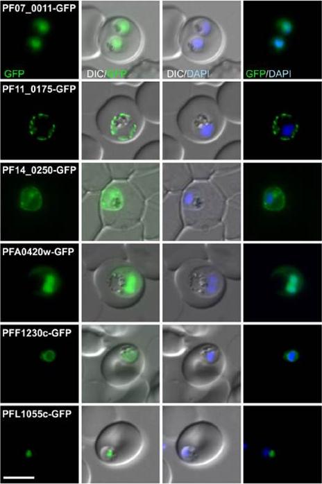 Fluorescence pattern of non-exported (B) or exported (C) GFP fusion proteins. PF07_0011 . unknown function; PF11_0175 heat shock protein 101; PF14_0250 lipase; PFA0429w unknown function; PFF1230c unknown function; PFL1055c unknown function. PF07_0011 and PFA0420w were in the nucleus with a cytoplasmic pool, PF11_0175 and PF14_0250 were at the parasite periphery (consistent with a PPM, PV or PVM location, PFF1230c was perinuclear, suggesting an ER location, and PFL1055c was found in a nucleus proximal focus that co-localized with the GolgiHeiber A, Kruse F, Pick C, Grüring C, Flemming S, Oberli A, Schoeler H, Retzlaff S, Mesén-Ramírez P, Hiss JA, Kadekoppala M, Hecht L, Holder AA, Gilberger TW, Spielmann T. Identification of New PNEPs Indicates a Substantial Non-PEXEL Exportome and Underpins Common Features in Plasmodium falciparum Protein Export. PLoS Pathog. 2013 9(8):e1003546.
