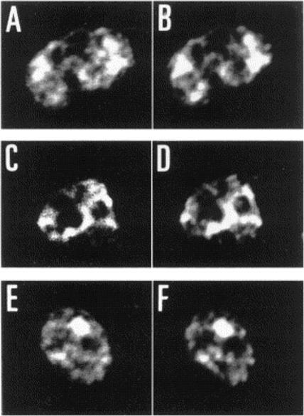 Confocal immunofluorescence co-localization of PfERC with the ER-located protein, Pfgrp (PFI0875w). Mature trophozoite-infected erythrocytes (D10 strain, Panels A–D or FCR3strain, Panels E–F) were double-labeled with mouse antiserum against recombinant Pfs40:PfERC produced in either yeast (Panels A,E) or E. coli (Panel C), followed by FITC-conjugated anti-mouse antibodies and a rabbit anti-Pfgrp antiserum followed by a Cy3-conjugated anti-rabbit antibodies (Panels B,D,F). An optical slice was collected through the centre of the parasites by confocal microscopy. Dual images were collected simultaneously and are displayed as isolated fluorescein fluorescence (Panels A,C,E) and isolated Cy3 fluorescence (Panels B,D,F) of the same cell. Labeling pattern suggests localization of PfERC within structures within the parasite cytoplasm. Staining profile for the known ER-resident protein, Pfgrp exactly co-localize with PfERC.La Greca N, Hibbs AR, Riffkin C, Foley M, Tilley L. Identification of an endoplasmic reticulum-resident calcium-binding protein with multiple EF-hand motifs in asexual stages of Plasmodium falciparum. Mol Biochem Parasitol. 1997 89:283-93. Copyright Elsevier