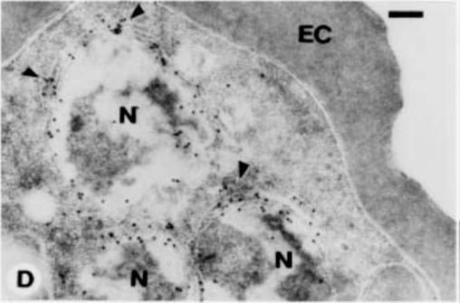 Immunoelectron microscopy of LR White sections of asexual schizont stage were fixed in 1% paraformaldehyde:0.2% glutaraldehyde and incubated with sera (M40) against E. coli-produced Pfs40 MBP-fusion protein. Arrows point to labeling with gold particles. Nucleus (N); erythrocyte cytoplasm (EC). Bar equals 2.0 mM. This result indicates localization in a membrane-bound compartment adjacent to the nucleus that is suggestive of endoplasmic reticulumTempleton TJ, Fujioka H, Aikawa M, Parker KC, Kaslow DC. Plasmodium falciparum Pfs40, renamed Pf39, is localized to an intracellular membrane-bound compartment and is not sexual stage-specific. Mol Biochem Parasitol. 1997 ;90:359-65. Copyright Elsevier 2009.