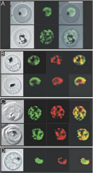 Different PfRabs have different sub-cellular distributions in schizont-infected erythrocytes. Panel (A) shows control rabbit pre-immune serum. Panel (B) shows a multinucleated schizont decorated with anti-PfRab1A antibodies giving a perinuclear staining. Panels (C) and (D) (phase contrast) show the pattern obtained with the anti-PfRab11A antibodies. Clearly, PfRab1A and PfRab11A display different distributions. Panel (E) shows the pattern obtained with anti-Pf39 (ERC) antibodies specific for the endoplasmic reticulum. Panel (F) shows a double-labelling with anti-PfRab1A (green) and Pf39 (red) antibodies, where colocalization stains yellow. Panel (G) shows a double-labelling with anti-PfRab11A (green) and anti-Pf39 (red) and no co-localization is observed. Panel (H) shows anti-PfRab6 (green) and anti-Pf39 (red), where co-localization stains yellow.Quevillon E, Spielmann T, Brahimi K, Chattopadhyay D, Yeramian E, Langsley G. The Plasmodium falciparum family of Rab GTPases. Gene. 2003 306:13-25.