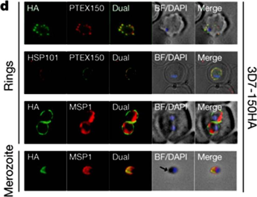 HSP101 and PTEX150 co-localize and have dual apical merozoite and PVM localization. Double labelling IFA on fixed 3D7-150HA ring- and merozoite-stage parasites using the antibodies as indicated. 3D7-150HA is a transgenic P. falciparum (3D7) parasite line where the endogenous gene was modified at its carboxy terminus to include a triple haemagglutinin (HA) epitope tag. The arrows indicate the apical end of the merozoite. BF, bright-field; DAPI, nucleic acid stain 49,6-diamidino-2-phenylindole. PTEX150 and HSP101 co-localize and are found in discrete foci in the membranes surrounding the ring-stage parasite. This membrane is the PVM, as fluorescence surrounds the parasite membrane marker MSP1 (PFI1475w).de Koning-Ward TF, Gilson PR, Boddey JA, Rug M, Smith BJ, Papenfuss AT, Sanders PR, Lundie RJ, Maier AG, Cowman AF, Crabb BS. A newly discovered protein export machine in malaria parasites. Nature. 2009 459(7249):945-9.