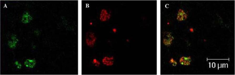 Location of Pfdyn1 in P. falciparum-infected erythrocytes by immunofluorescence microscopy. Percoll-synchronized late stage cells were smeared onto coverslips and fixed in acetone for 10 min at room temperature. The smears were probed with purified rabbit anti-Pfdyn1-C antibody (1:300) and rat anti-PfGRP antiserum (1:500). Binding of rabbit antibodies was visualized using goat anti-rabbit IgG conjugated with rhodamine. Binding of rat antibodies was visualized using goat anti-rat IgG conjugated with FITC. Coverslips were viewed under Leica TCS NT laser confocal scanning microscope. (A) FITC fluorescent; (B) rhodamine fluorescent; and (C) merged. The location of Pfdyn1 partially overlapped with that of PfGRP PFI0875w, an ER-resident protein. There iss a partial overlap of intracellular localization between Pfdyn1 and PfGRP.Li H, Han Z, Lu Y, Lin Y, Zhang L, Wu Y, Wang H. Isolation and functional characterization of a dynamin-like gene from Plasmodium falciparum. Biochem Biophys Res Commun. 2004 320:664-71. Copyright Elsevier 2011.