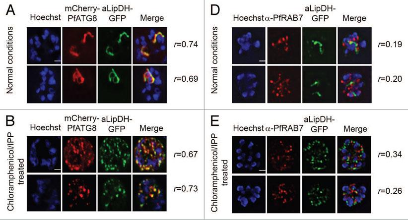 PfATG8, but not PfRAB7, colocalizes with apicoplast-targeted vesicles and apicoplast remnants. (A and B) P. falciparum expressing both mCherry-PfATG8 and aLipDH-GFP (lipoamide dehydrogenase) were treated with chloramphenicol to chemically disrupt the formation of the apicoplast, and IPP added to the culture medium to maintain viability of the parasites. DMSO control (A) and chloramphenicol treated (B) infected erythrocytes were counterstained with Hoechst 33258. The Pearson’s coefficients (r) show the degree of colocalization in each individual image. (D and E) Transgenic parasites expressing aLipDH-GFP were treated as above. Immunofluorescence analyses of untreated controls (D) or chloramphenicol/IPP treated (E) and were performed using anti-PfRAB7 antibodies (red). Hoechst 33258 (blue) was used to stain the nuclei. Scale bar: 2 μm.Tomlins AM, Ben-Rached F, Williams RA, Proto WR, Coppens I, Ruch U, Gilberger TW, Coombs GH, Mottram JC, Müller S, Langsley G. Plasmodium falciparum ATG8 implicated in both autophagy and apicoplast formation. Autophagy. 2013 Aug 29;9(10). PMID: 2402567