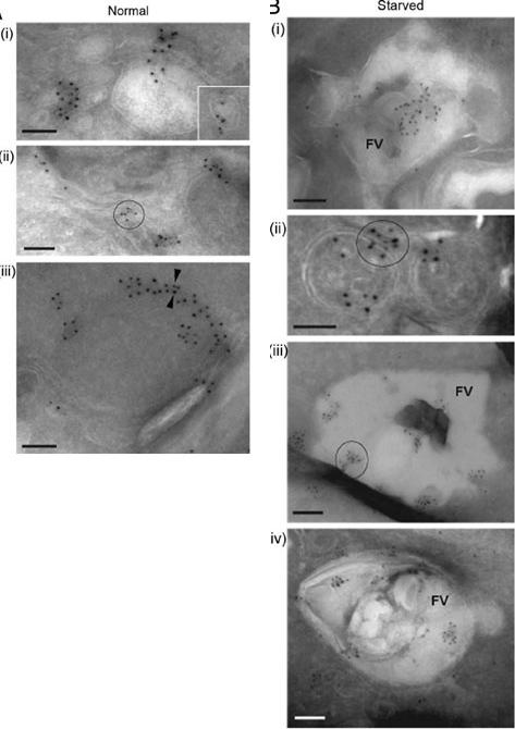 Left-normal: A iii) and PfRAB7 (5-nm gold particles, A iii). (A) PfATG8 and PfRAB7 decorate vesicles (i and insert) and membranous tubules (ii) in the cytoplasm. On some occasions, Immunogold staining of P. falciparum under normal growth conditions and under conditions of amino acid-deprivation (starved) reveals the subcellular localization of PfATG8 (10-nm gold particlesPfATG8 and PfRAB7 occurred at the periphery of double-membrane-bound organelles (iii, arrowheads). Scale bars: 100 nm. PfATG8 and PfRAB7-labeled vesicles (i and insert) and membranous tubules (ii) and PfATG8 also occurred at the periphery of double membrane bound organelles (iii, arrowheads).Right-starved: PfATG8 and PfRAB7 associatedwith large structures corresponding to the food vacuole (FV; i). Costaining of PfATG8 and PfRAB7 is also visible on small double-membrane-boundstructures (ii), or very large FV vesicles (iii and iv). Scale bars: 100 nm. Upon amino acid deprivation an enhanced colocalization of PfATG8 and PfRAB7with the acidic food vacuole (FV) occurred (i, iii and iv) and also on small double-membrane-bound structures (ii).Tomlins AM, Ben-Rached F, Williams RA, Proto WR, Coppens I, Ruch U, Gilberger TW, Coombs GH, Mottram JC, Müller S, Langsley G. Plasmodium falciparum ATG8 implicated in both autophagy and apicoplast formation. Autophagy. 2013 Aug29;9(10).