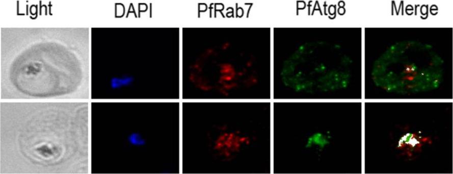 Immunofluorescence showing colocalization (white) of PfRab7 (red) and PfAtg8 (green) in normal and starvation culture conditions. PfRab7+/PfAtg8+ double labeled autophagosomes can be found at the food vacuole suggesting that it, rather than lysosomes, is the final lytic compartment in malaria parasite autophagy.Ben-Rached F & Langsley G (2014) Rab GTPases in Plasmodium. These figures were published in the Encyclopedia of Malaria edited by Marcel Hommel and Peter G. Kremsner (Springer New York)