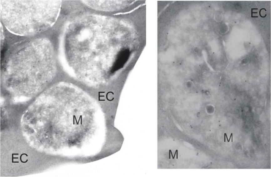 Immunoelectron microscopy. Late-schizont stage parasites were incubated with anti-falstatin antibodies and gold-conjugated second antibody and then evaluated by electron microscopy. Labels show individual merozoites (M) and erythrocyte cytosol (EC). Falstatin localizes to the periphery of rings and early schizonts, is diffusely expressed in late schizonts and merozoites, and is released upon the rupture of mature schizonts.Pandey KC, Singh N, Arastu-Kapur S, Bogyo M, Rosenthal PJ. Falstatin, a cysteine protease inhibitor of Plasmodium falciparum, facilitates erythrocyte invasion. PLoS Pathog. 2006 2(11):e117.