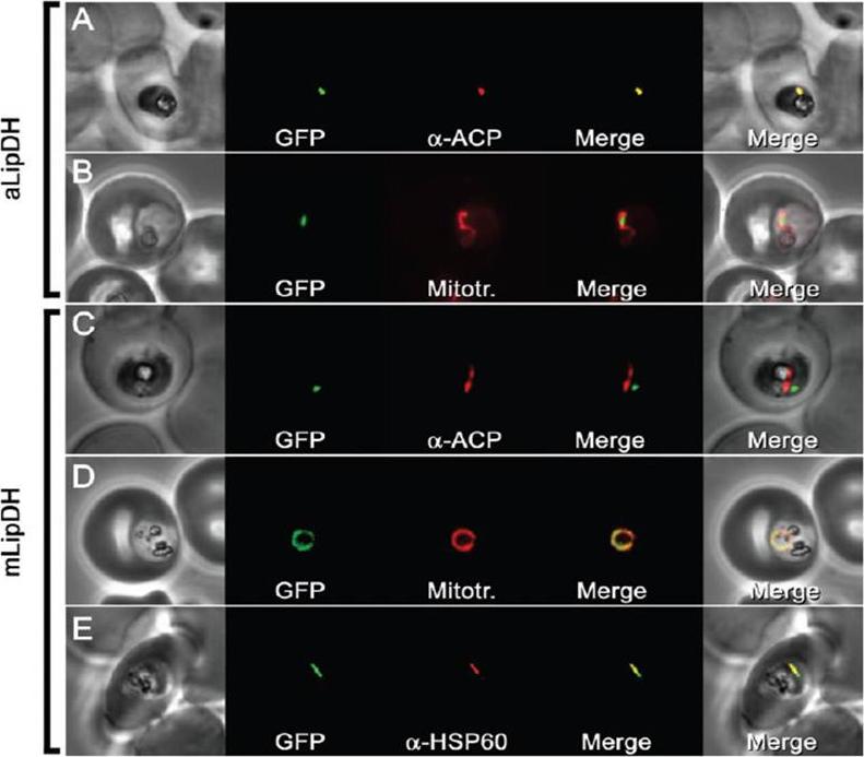 Localization of apicoplast and mitochondrial LipDH. The localization of aLipDH and mLipDH was investigated by expressing the putative N-terminal presequences fused to GFP in P. falciparum intraerythrocytic parasites. A and B. Colocalization with antibodies directed against the apicoplast-resident acyl-carrier protein PFB0385w (ACP; A) and with MitoTracker Red (B) demonstrates that the putative apicoplast targeting presequence of aLipDH targets the marker protein GFP exclusively to the apicoplast. C–E. Colocalization experiments with the apicoplast protein ACP (C) and with the two mitochondrial markers MitoTracker Red and HSP60 PF10_0153 (D and E) indicate that mLipDH is localized exclusively in the mitochondrion.McMillan PJ, Stimmler LM, Foth BJ, McFadden GI, Müller S. The human malaria parasite Plasmodium falciparum possesses two distinct dihydrolipoamide dehydrogenases. Mol Microbiol. 2005 55:27-38. Copyright John Wiley & Sons Ltd. 2010.