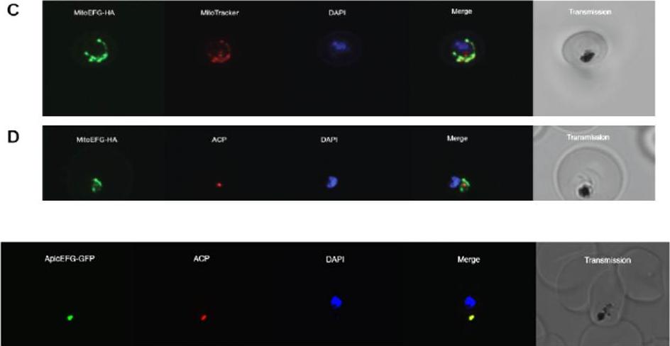C. An immunofluorescence assay on D10 parasites expressing MitoEFG-HA reveals that PFL1590c is localised to the P. falciparum mitochondrion. MitoEFG-HA (green) co-localises with MitoTracker labelling of the mitochondrion (red). DNA stained with Hoescht 33342 (blue). D. An immunofluorescence assay on the MitoEFG-HA expressing parasites counterstained with the ACP antibody as an apicoplast marker. MitoEFG-HA protein localises to the typically elongated mitochondrion (green), but does not co-localise with the punctate apicoplast (red). DNA stained with Hoescht 33342 (blue).Lower row: PFF0115c was fused to a C-terminal GFP tag to create the construct ApicEFG-GFP. An immunofluorescence assay on D10 parasites expressing ApicEFG-GFP reveals that PFF0115c is localised to the P. falciparum apicoplast. ApicEFG-GFP (green) co-localises with ACP labelling of the apicoplast (red), and shows the dot-like organelle typical of the P. falciparum apicoplast during the ring stage of the asexual cycle. DNA stained with Hoescht 33342 (blue).Johnson RA, McFadden GI, Goodman CD. Characterization of two malaria parasite organelle translation elongation factor g proteins: the likely targets of the anti-malarial fusidic Acid. PLoS One. 2011;6(6):e20633.