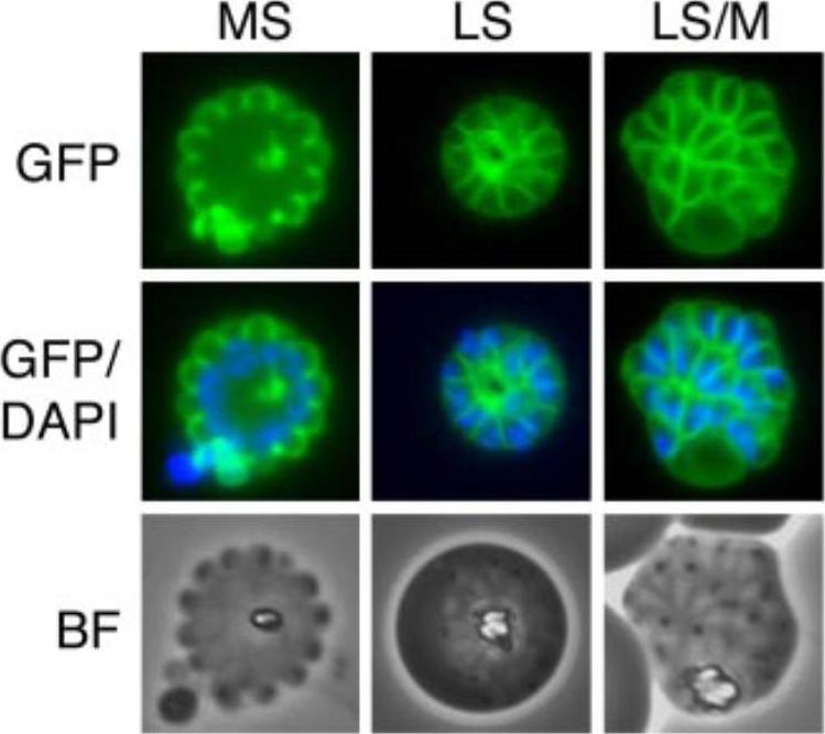 Localization of Pf12 fused to a GFP reporter and expressed in an inducible system that allows strong surface expression. MS, mid-schizont; LS, late schizont; M, merozoite. Pf12 fusion protein was localized to the merozoite surface. Pf12 is a GPI-anchored protein. Sanders PR, Gilson PR, Cantin GT, Greenbaum DC, Nebl T, Carucci DJ, McConville MJ, Schofield L, Hodder AN, Yates JR 3rd, Crabb BS. Distinct protein classes including novel merozoite surface antigens in Raft-like membranes of Plasmodium falciparum. J Biol Chem. 2005 280:40169-76.