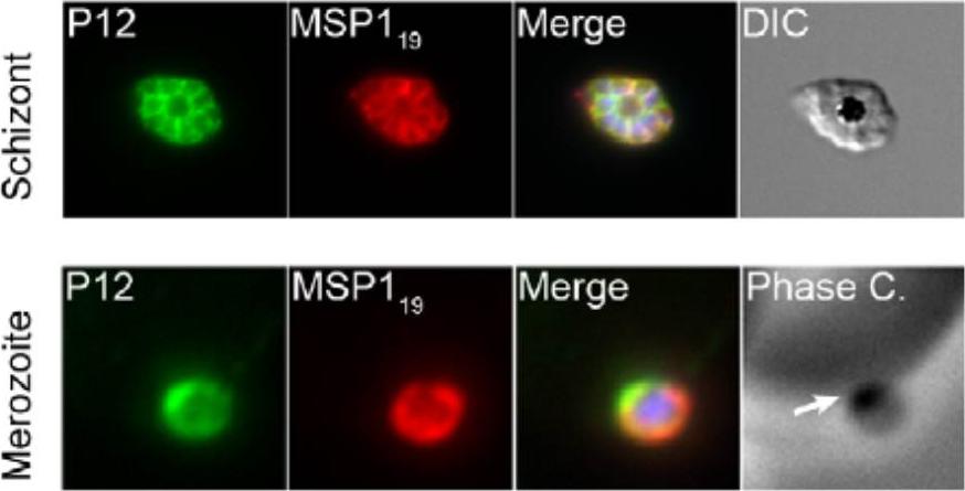 Localisation of P12 was explored by immunofluorescence assays. Schizonts and merozoites were fixed and labelled with mouse anti-MSP119 (10 mg/mL) and rabbit IgG to P12 (50 mg/mL) followed by Alexa Fluor 488 goat anti-rabbit and Alexa Fluor 568 goat anti-mouse secondary antibodies IgG. P12 was found to localise to the parasitophorous vacuole in schizonts and on the merozoite surface upon comparison with MSP119. Interestingly, P12 exhibited concentrated apical localisation on the merozoite surface. Taechalertpaisarn T, Crosnier C, Bartholdson SJ, Hodder AN, Thompson J, Bustamante LY, Wilson DW, Sanders PR, Wright GJ, Rayner JC, Cowman AF, Gilson PR, Crabb BS. Biochemical and Functional Analysis of Two Plasmodium falciparum Blood-Stage 6-Cys Proteins: P12 and P41. PLoS One. 2012;7(7):e41937.