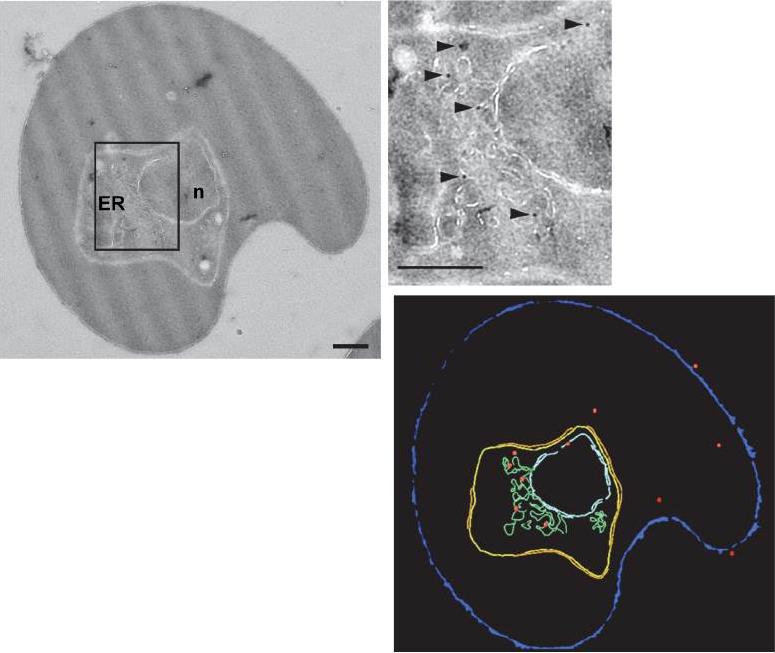 Subcellular localization of PfUT by immunoelectron microscopy. The upper panel shows a repre-sentative micrograph of a P. falciparum-infected erythrocyte preserved by high-pressure freezing and freeze-substitution, and immunolabelled with a rabbit antiserum specific to the N-terminal domain of PfUT (1:100) coupled to 10 nm protein A colloidal gold. The lower panel shows the surface rendered view of the micrograph, with red dots representing gold grains. Insert: Magnification of boxed section in micrograph. Arrowheads point towards gold label. n, nucleus; fv, food vacuole. Scale bar in D and E, 500 nm. Gold grains were significantly more present in areas of ER/Golgi complex (ER) than in other subcellular compartments.Sanchez CP, Liu CH, Mayer S, Nurhasanah A, Cyrklaff M, Mu J, Ferdig MT, Stein WD, Lanzer M. A HECT Ubiquitin-Protein Ligase as a Novel Candidate Gene for Altered Quinine and Quinidine Responses in Plasmodium falciparum. PLoS Genet. 2014 10(5):e1004382.