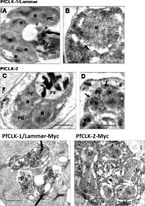 Upper two rows: Ultrastructural localization of PfCLKs in the parasite blood stages. Post-embedding immunoelectron microscopy labelling was performed using mouse antisera against PfCLK-1 and PfCLK-2, respectively, in combination with secondary gold-conjugated antibody. A: PfCLK-1/Lammer is predominantly present in the nucleus of a blood stage schizont. B: A distinct labelling of PfCLK-1 in the passage between nucleus and cytoplasm (arrow) was detected in another schizont. C: PfCLK-2 is expressed in the nucleus as well as the cytoplasm of a late trophozoite. D: PfCLK-2 labelling was particularly detected in the passage between nucleus and cytoplasm (arrows) of a schizont. E, erythrocyte; FV, food vacuole; MC, Maurer´s cleft; N, nucleus; PC, parasite cytoplasm; R, rhoptry. Bar, 0.5 μm. Lower row: Expression of Myc-tagged PfCLKs in blood stages. Post-embedding immunoelectron microscopy labelling was performed using anti-Myc antibody in combination with secondary gold-conjugated antibody. PfCLK-1/Lammer-Myc is predominantly present in the nucleus of a trophozoite. PfCLK-2-Myc can be detected in the nucleus and the cytoplasm of a schizont. E, erythrocyte; HZ, hemozoin; N, nucleus; PC, parasite cytoplasm. Bar, 0.5 μm.Agarwal S, Kern S, Halbert J, Przyborski JM, Baumeister S, Dandekar T, Doerig C, Pradel G. Two nucleus-localized CDK-like kinases with crucial roles for malaria parasite erythrocytic replication are involved in phosphorylation of splicing factor. J Cell Biochem. 2011 112:1295-310.