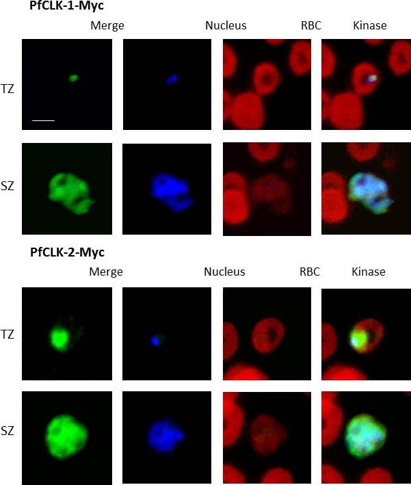 Expression of Myc-tagged PfCLKs in blood stages. Indirect immunofluorescence assay using anti-Myc antibody showed a distinct punctate protein expression of PfCLK-1-Myc in association with the nucleus of trophozoites (TZ) and schizonts (SZ). PfCLK-2-Myc localizes in the nucleus and cytoplasm of blood stage parasites. Kinase labelling was visualized with AlexaFluor488 secondary antibody (green), nuclei were highlighted by Hoechst staining (blue), red blood cells (RBC) were counterstained with Evans Blue (red). Bar, 5 μm. Immunofluorescence assay on methanol-fixed mutants, using anti-Myc antibody, showed punctate expression of PfCLK-1-Myc in the nuclei of trophozoites and schizonts, while PfCLK-2-Myc was present in the nuclei and the cytoplasm of blood stagesAgarwal S, Kern S, Halbert J, Przyborski JM, Baumeister S, Dandekar T, Doerig C, Pradel G. Two nucleus-localized CDK-like kinases with crucial roles for malaria parasite erythrocytic replication are involved in phosphorylation of splicing factor. J Cell Biochem. 2011 112:1295-310.