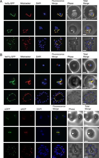 Subcellular localization of IscS and Isd11 to the mitochondrion of P. falciparum. A) Epifluorescent images of live P. falciparum erythrocytic-stage parasites expressing GFP fused to full-length IscS (IscSfl-GFP). The parasites were stained with mitotracker to identify mitochondria and DAPI to identify nuclei. Image z-stacks were deconvolved and then presented as a single combined image. Scale bar = 2 mm. B) Epifluorescent images similar to those in (A) of parasites expressing GFP fused to full length Isd11 (Isd11fl-GFP). IscS and Isd11 co-localize with mitotracker in all erythrocytic stages: late ring (top panels), late trophozoite or early schizont (middle panels), and schizont (lower panels) stage parasites. Lowest panel) Subcellular localization of the IscS leader peptide to the mitochondrion of P. falciparum. Epifluorescent images of live P. falciparum erythrocytic-stage parasites expressing GFP fused to the leader peptide of IscS (amino acids 1–35). The parasites were stained with mitotracker to identify mitochondria and DAPI to identify nuclei. Image z-stacks were deconvolved and then presented as a single combined image. Scale bar = 2 µm.Gisselberg JE, Dellibovi-Ragheb TA, Matthews KA, Bosch G, Prigge ST. The Suf Iron-Sulfur Cluster Synthesis Pathway Is Required for Apicoplast Maintenance in Malaria Parasites. PLoS Pathog. 2013 9(9):e1003655