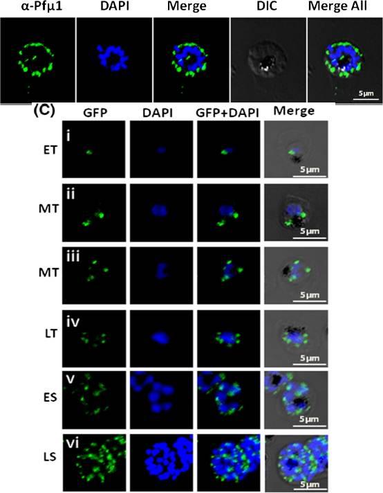 Up: Expression and localization of Pfμ1 protein in P. falciparum. Immunofluorescence analysis using the anti-Pfμ1 antibody, demonstrating discreet punctate structures in schizont stage parasites. Parasite nuclei were stained with DAPI; scale bars denote 5 μm. The well-defined punctate structures in schizont stage of the parasite, a pattern characteristic of staining for apical secretory organelles. Lower panel: Live cell imaging of transgenic parasites expressing the Pfμ1–GFP fusion protein fromearly trophozoite to late schizont stages. Parasite nuclei were stained with DAPI; scale bars denote 5 μM. ET, Early Trophozoite; MT, Mid Trophozoite; LT, Late Trophozoite; ES, Early Schizont; LS, Late Schizont. 10–18 h postinvasion, Pfμ1–GFP was observed as a single spot in a small compartment in close proximity to the nucleus (i). After further development, in young trophozoite stages (20–24 h post invasion), two to four fluorescent puncta were observed adjacent to the nucleus (ii–iv). As nuclear division commences (~32 h post invasion), Pfμ1–GFP was localized in multiple compartments, ensuring that each merozoite inherits one such spot (v). At the mature schizont stage, a welldefined punctate staining was seen, typical of apical organelle distribution of proteins in Plasmodium (vi).Kaderi Kibria KM, Rawat K, Klinger CM, Datta G, Panchal M, Singh S, Iyer GR, Kaur I, Sharma V, Dacks JB, Mohmmed A, Malhotra P. A role for adaptor protein complex 1 in protein targeting to rhoptry organelles in Plasmodium falciparum. Biochim Biophys Acta. 2015 1853(3):699-710.