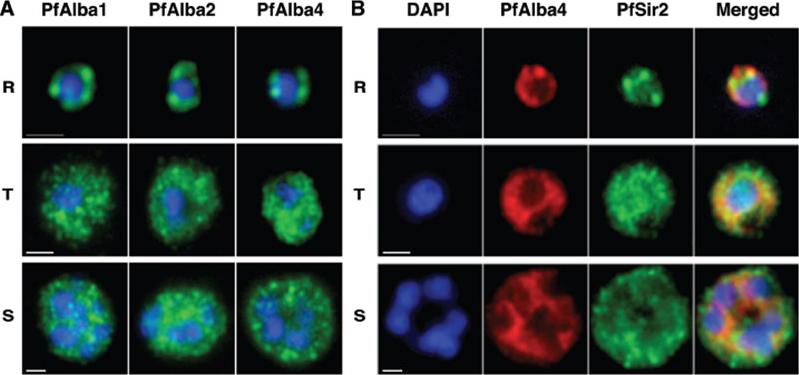 PfAlbas localize to perinuclear foci in ring stages and expand to the cytoplasm in mature forms. (A) Immunofluorescence analysis of PfAlba1, PfAlba2 and Pfalba4 distribution throughout the parasite life cycle (Rings, Trophozoites, Schizonts). The anti-PfAlba antibodies (Ab 74–2 for PfAlba1; Ab 233 for PfAlba2; Ab 237–2 for PfAlba4) were used at 5.5, 4.5 and 8 mg/ml, respectively. Anti-rabbit Alexa-488 secondary antibodies (Molecular Probes) were used at a dilution of 1:500. Scale bars represent 1 mm. (B) Immunofluorescence analysis of 3D7 Rings, Trophozoites and Schizonts stained with anti-PfAlba4 (red) and anti-PfSir2 (green) antibodies. Scale bar represents 1 mm.Chêne A, Vembar SS, Rivière L, Lopez-Rubio JJ, Claes A, Siegel TN, Sakamoto H, Scheidig-Benatar C, Hernandez-Rivas R, Scherf A. PfAlbas constitute a new eukaryotic DNA/RNA-binding protein family in malaria parasites. Nucleic Acids Res. 2012 40(7):3066-77
