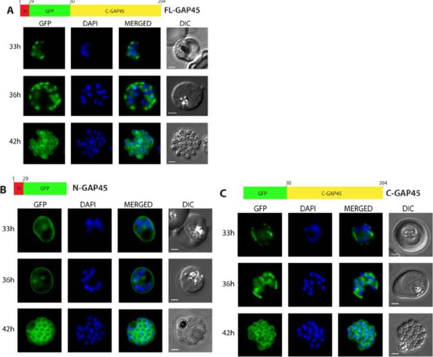 Upper row: PfGAP45 co-localizes with the IMC marker PfMTIP. Immunofluorescence assays were performed using anti-GFP (red) and anti-PfMTIP (green) antibodies on parasites over-expressing PfGAP45-GFP. PfGAP45 shows co-localization with PfMTIP around the periphery of merozoites in mature schizonts. Middle row: PfGAP45 phosphorylation mutants co-localize with endogenous PfGAP45. Immunofluorescence assays were performed using anti-GFP (green) and anti-PfGAP45 (red) antibodies to localize episomally expressing GAP45-GFP and endogenous PfGAP45.Lower row: Live Imaging of PfGAP45 GFP in parasites over-expressing PfGAP45-GFP was performed after labeling the nuclei with DAPI. Thomas DC, Ahmed A, Gilberger TW, Sharma P. Regulation of Plasmodium falciparum Glideosome Associated Protein 45 (PfGAP45) Phosphorylation. PLoS One. 2012;7(4):e35855.