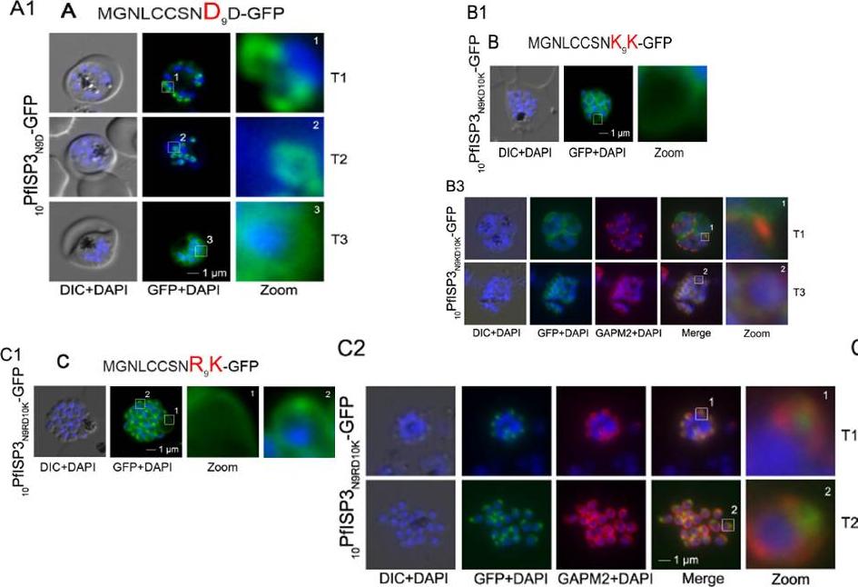 Re-direction of the IMC 10PfISP3-GFP fusion protein to the rhoptry membrane. A. Substitution of N9 with D (10PfISP3N9D-GFP, A) does not interfere with correct IMC recruitment of the GFP-fusion protein (A1). Nuclei stained with DAPI (blue). B-C. The substitution of N9 and D10 with lysine and its expression in the parasite (10PfISP3N9KD10K-GFP) leads to a peripheral localization (B1). The zoom highlights the additional association of this mutant protein with the food vacuole membrane. B2. Western blot analysis using anti-GFP antibodies. B3 Co-localization with the IMC marker GAPM2. Nascent IMC (anti-GAPM2, red) is clearly distinguishable from the peripheral associated 11PfISP1D11K-GFP in early stages (T1) and congruent in late stages (T3). C. In contrast, the substitution of N9 with arginine (10PfISP3N9RD10K-GFP) re-directs the fusion protein to cell periphery (zoom 1) and the apical pole (zoom 2). C2. Co-localization with the rhoptry marker RALP (anti-RALP, red) in fixed cells confirmed PfDHHC1-GFP IMC localization shown here in an early stage of TMC biogenesis (T1). Wetzel J, Herrmann S, Swapna LS, Prusty D, Peter AT, Kono M, Saini S, Nellimarla S, Wong TW, Wilcke L, Ramsay O, Cabrera A, Biller L, Heincke D, Mossman K, Spielmann T, Ungermann C, Parkinson J, Gilberger TW. The role of palmitoylation for protein recruitment to the inner membrane complex of the malaria parasite. J Biol Chem. 2014 Nov 25. PMID: