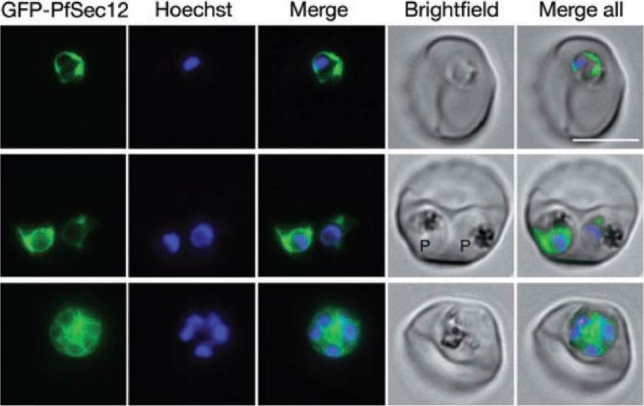 Live cell imaging of parasites expressing GFP–PfSec12 from the endogenous pfsec12 5′ UTR. Nuclei were stained with Hoechst 33342. GFP–PfSec12 is distributed in a perinuclear pattern with additional reticular protrusions characteristic of the parasite ER. Parasites at the ring, trophozoite and schizont stages are shown in the top, middle and bottom rows respectively. Note that the trophozoites (labelled P) were in a doubly infected erythrocyte. Bar = 5 mm.Lee MC, Moura PA, Miller EA, Fidock DA. Plasmodium falciparum Sec24 marks transitional ER that exports a model cargo via a diacidic motif. Mol Microbiol. 2008 68:1535-46.