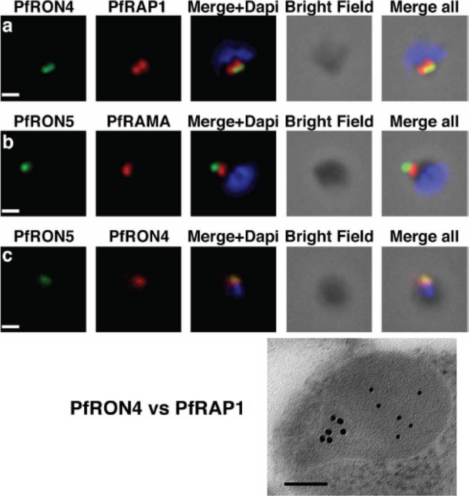 The PfRON4 and PfRON5 proteins localize to the rhoptry neck. A, Antibodies raised against PfRON4 and PfRON5 recognize specific protein products in schizont parasite extracts. B, IFAs using the anti-PfRON antibodies reveal staining of the apical tip of free merozoite, in close apposition with the rhoptry bulb markers PfRAP1 and PfRAMA, suggesting a rhoptry neck localization. Scale bar: 0.2μm C, Immunoelectron microscopy confirms that PfRON 4 localizes to the rhoptry neck. Scale bar: 0.1μmRichard D, Macraild CA, Riglar DT, Chan JA, Foley M, Baum J, Ralph SA, Norton RS, Cowman AF. Interaction between Plasmodium falciparum apical membrane antigen 1 and the Rhoptry neck protein complex defines a key step in the erythrocyte invasion process of malaria parasites. J Biol Chem. 2010 285:14815-22
