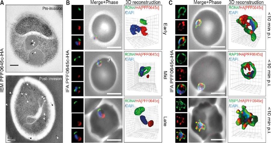 Wide field IFA time course of invasion using A) anti-RAP1/PfRON4. Pre-egress shows standard wide-field image. Invasion images show IFA with deconvolution (single slice). Before invasion commencement, RAP1 clearly remained within the merozoite apex (RAP1 early) posterior to the rhoptry neck as defined by PfRON4. Midinvasion merozoites revealed that RAP1 labeling had moved to an anterior position beginning immediately adjacent to the junction and tracking the exterior of the merozoite as it entered (RAP1 mid). These observations show clearly RAP1 transition pre-, mid-, and postinvasion.Riglar DT, Richard D, Wilson DW, Boyle MJ, Dekiwadia C, Turnbull L, Angrisano F, Marapana DS, Rogers KL, Whitchurch CB, Beeson JG, Cowman AF, Ralph SA, Baum J. Super-resolution dissection of coordinated events during malaria parasite invasion of the human erythrocyte. Cell Host Microbe. 2011 9:9-20.