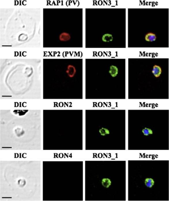 PfRON3 exists in parasitophorous vacuole in ring stage parasites. (A) Ring stage parasites were dual-labeled with antisera against PfRON3_1 and either PfRAP1 (PV marker), PfEXP2 (PVM marker), PfRON2, or PfRON4. Nuclei are visualized with DAPI in merged images shown in the right panels. Bars represent 2.5 μm.Ito D, Han ET, Takeo S, Thongkukiatkul A, Otsuki H, Torii M, Tsuboi T. Plasmodial ortholog of Toxoplasma gondii rhoptry neck protein 3 is localized to the rhoptry body. Parasitol Int. 2011 60(2):132-8.