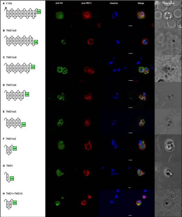 Gene expression constructs not targeted to the apicoplast now co-localised with the plasma membrane. TMDs are represented by boxes and are joined by loops. All PfoTPT constructs are episomally expressed under the PfCRT promoter and tagged with triple HA at the C-terminus detected with anti-HA and secondary antibody conjugated to FITC (green). The parasite plasma membrane is detected with anti-PfNTP1 (red). Nuclei are stained with Hoechst (blue), and transmitted light images of the parasites within their host red blood cell are shown at right. Scale bars = 2μm. A. Point mutation of tyrosine residue at position 10 (✪) in the synthetic PfoTPT (Y10A) relocates protein from the apicoplast (B) to the plasma membrane. B. Removal of TMD 10 (TMD1to9), which completely abrogates targeting to the apicoplast (C), does not result in plasma membrane localisation. C. Removal of TMDs 9 and 10 (TMD1to8), which completely abrogates targeting to the apicoplast (D), results in some protein localisation to the plasma membrane. D. Removal of TMDs 7, 8, 9 and 10 (TMD1to6), which completely abrogates targeting to the apicoplast (E), results in localisation of the protein that mostly overlaps with the parasite plasma membrane marker, PfNT1. Note that the erythrocyte is infected with three separate parasites. E. Removal of TMDs 6, 7, 8, 9 and 10 (TMD1to5), which completely abrogates targeting to the apicoplast (F), results in localisation of the protein that mostly overlaps with the parasite plasma membrane marker, PfNT1. Note that the erythrocyte is infected with two separate parasites. F. Removal of TMDs 3, 4, 5, 6, 7, 8, 9 and 10 (TMD1to2), which completely abrogates targeting to the apicoplast (G), results in some re-localisation of the protein to the plasma membrane. G. Removal of TMDs 2, 3, 4, 5, 6, 7, 8, 9 and 10 (TMD1), which completely abrogates targeting to the apicoplast (H), results in some localisation of the protein to the plasma membrane. H. Recombining TMD1 with TMD10 (TMD1+10) was unable to reconstitute apicoplast targeting (I) and resulted in some plasma membrane targeting.Lim L, Sayers CP, Goodman CD, McFadden GI. Targeting of a Transporter to the Outer Apicoplast Membrane in the Human Malaria Parasite Plasmodium falciparum. PLoS One. 2016 11(7):e0159603.