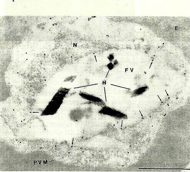 Immunoelectron microscopy of P. falciparum-infected erythrocyte using anti-TCTP. FV – food vacuole. N – nucleus. P – parasite. Bar – 1 mm. TCTP was found to be located in both the cytoplasm and the food vacuole.Bhisutthibhan J, Philbert MA, Fujioka H, Aikawa M, Meshnick SR. The Plasmodium falciparum translationally controlled tumor protein: subcellular localization and calcium binding. Eur J Cell Biol. 1999 78:665-70. Copyright Elsevier 2011.