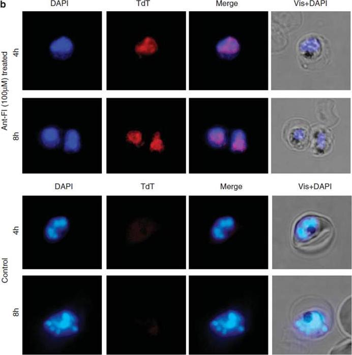 DNA fragmentation in P. falciparum parasites as assessed by TUNEL staining. Fluorescent microscopic images of TUNEL-positive parasites (TdT red staining) in treated cultures as compared with controls. The parasite nuclei were stained with DAPI (blue) and parasites were visualized by fluorescence microscope. Dl is a synthetic peptide that binds PfClpQ, thereby revealing it location. ClpQ protease is located in the matrix of the mitochondrion.Rathore S, Jain S, Sinha D, Gupta M, Asad M, Srivastava A, Narayanan MS, Ramasamy G, Chauhan VS, Gupta D, Mohmmed A. Disruption of a mitochondrial protease machinery in Plasmodium falciparum is an intrinsic signal for parasite cell death. Cell Death Dis. 2011 24;2:e231.